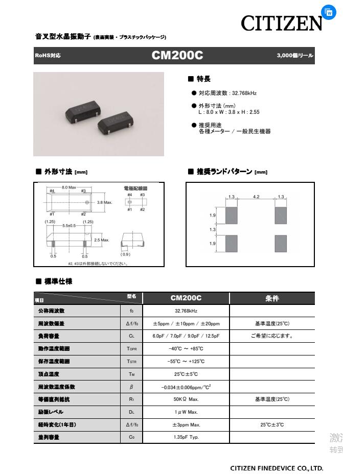 CM200C32768AZFT CITIZEN晶體 32.768kHz ±30ppm 12.5pF 50 kOhm -40°C ~ 85°C