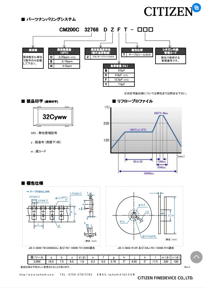 CM200C32768DZFT CITIZEN晶體 32.768kHz ±20ppm 12.5pF 50 kOhm -40°C ~ 85°C