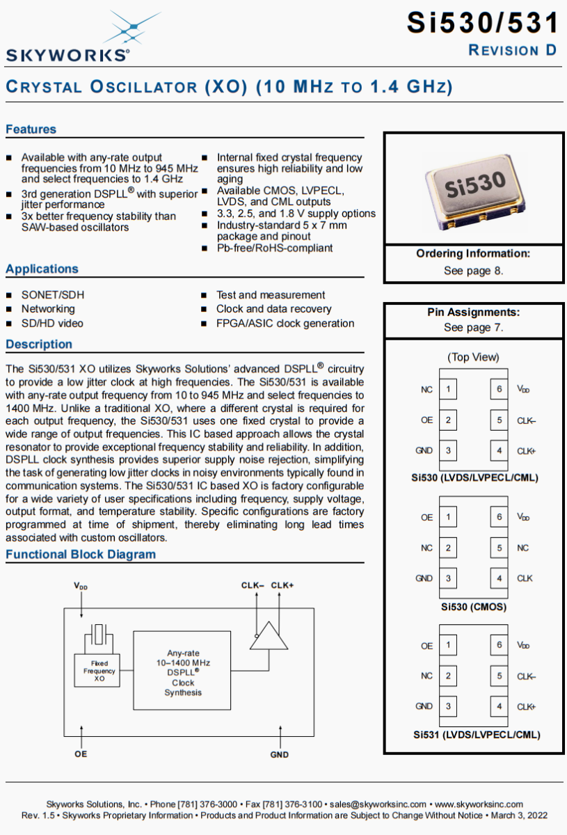 | 530AC106M250DG | Skyworks晶振 | Si530 | XO | 106.25 MHz | LVPECL | 3.3V | ±7ppm |