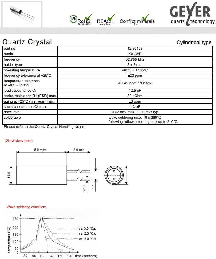 12.80103|32.768KHz|12.5pF|GEYER圓柱晶振,GEYER晶振,KX-38E圓柱晶振,無源晶振,12.80103晶振,石英晶體諧振器,3*8mm晶振,二腳插件晶振,頻率32.768KHz,負載12.5pF,頻率容差20ppm,工作溫度-40~105°C,耐高溫晶振,輕薄小晶振,高可靠性晶振,可穿戴設備晶振,實時時鐘晶振,微處理器晶振,數據中心晶振.