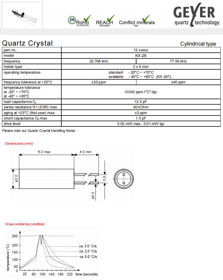 12.80116|32.768KHz|12.5pF|GEYER晶振,GEYER晶振,KX-26無源晶振,圓柱晶振,12.80116晶振,進口石英晶振,晶體諧振器,二腳插件晶振,2.0*6.0mm晶振,頻率32.768KHz,負載12.5pF,頻率容差20ppm,工作溫度-20~70°C,高可靠性晶振,高質量晶振,小體積晶振,兒童學習產品晶振,智能手表晶振,平板電腦晶振,DVD家電影音系統晶振.
