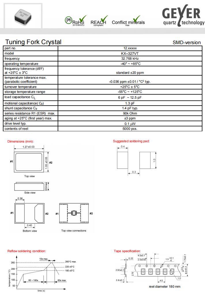 12.87000|32.768KHz|12.5pF|Geyer進口晶振,歐美晶振,Geyer進口晶振,KX-327VT無源晶振,12.87000晶振,二腳貼片晶振,1210mm晶振,石英晶體諧振器,SMD晶體,頻率32.768KHz,負載12.5pF,頻率容差20ppm,工作溫度-40~85°C,輕薄小晶振,高可靠性晶振,低老化晶振,可穿戴設備晶振,藍牙模塊晶振,智能手機晶振,筆記本電腦晶振.