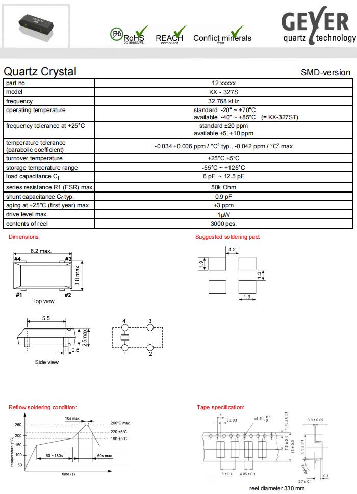 12.87110|32.768KHz|12.5pF|Geyer晶振,Geyer晶振,格耶晶振,歐美晶振,KX-327S無源晶振,進口石英晶振,12.87110晶振,8038mm晶振,晶體諧振器,四腳貼片晶振,頻率32.768KHz,負載12.5pF,頻率容差30ppm,工作溫度-20~70°C,抗沖擊晶振,抗振動晶振,低老化晶振,數碼相機晶振,兒童學習產品晶振,大型家用電器晶振,電話機晶振.
