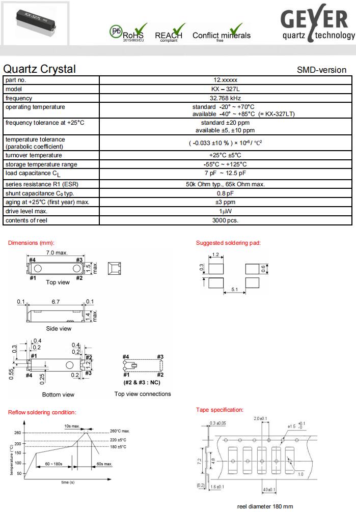 12.87130|32.768KHz|12.5pF|Geyer Crystal,Geyer晶振,KX-327L無源晶振,進口晶振,12.87130晶振,7015mm晶振,石英晶體諧振器,四腳貼片晶振,SMD晶振,頻率32.768KHz,負載12.5pF,頻率容差20ppm,工作溫度-20~70°C,無鉛環保晶振,高可靠性晶振,低老化晶振,家用電器遙控器晶振,鍵盤鼠標晶振,數碼相機晶振,兒童智能手表晶振.