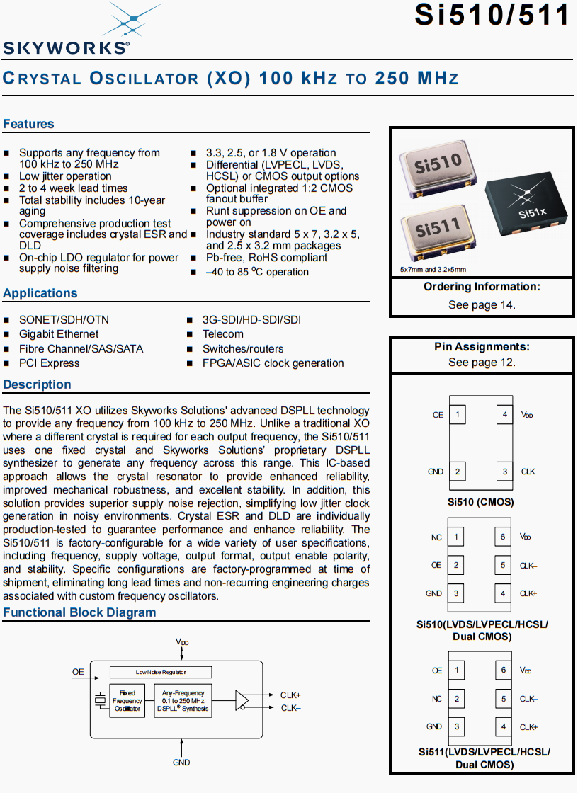 | 510KCA125M000BAG | Skyworks晶振 | Si510 | XO | 125 MHz | CMOS | 1.8V |
