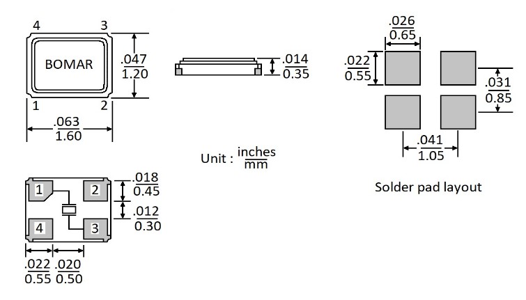 Bomar晶振,6G無線通信晶振,BC63小體積石英晶振尺寸圖