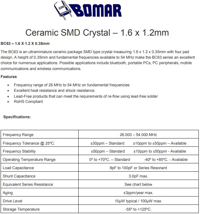 Bomar晶振,6G無線通信晶振,BC63小體積石英晶振規格表