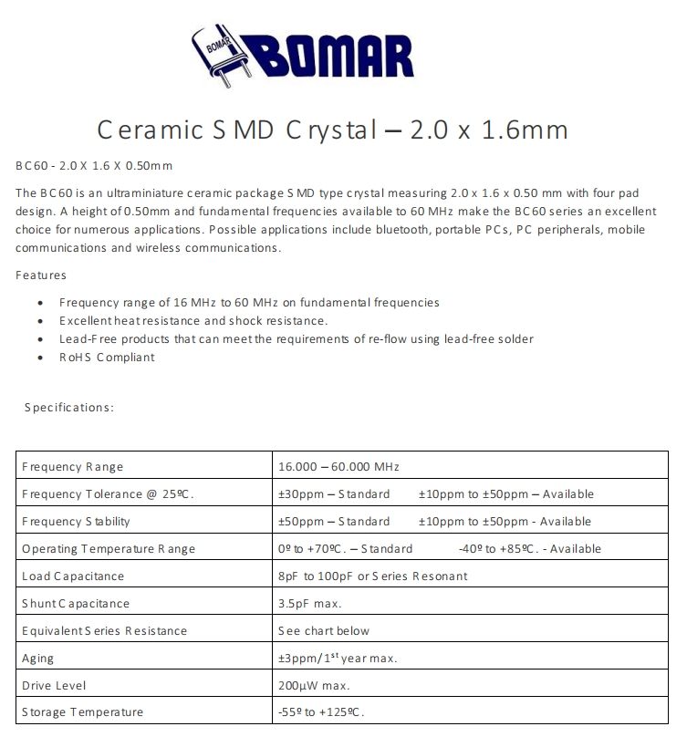 美國Bomar晶振,BC60進口貼片晶振,6G移動設備晶振,美國Bomar晶振,BC60系列是尺寸為2.0 x 1.6 x 0.50毫米的超微型陶瓷封裝晶體,0.50毫米的高度和60 MHz的基頻使BC60系列成為眾多應用的絕佳選擇,無源晶振,石英晶體諧振器,2016mm晶振,進口貼片晶振,6G移動設備晶振,耐高溫晶振,輕薄小晶振,應用領域包括無線通信,個人電腦,個人電腦外圍設備和移動通信等.