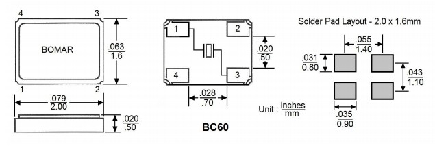 美國Bomar晶振,BC60進口貼片晶振,6G移動設備晶振尺寸圖