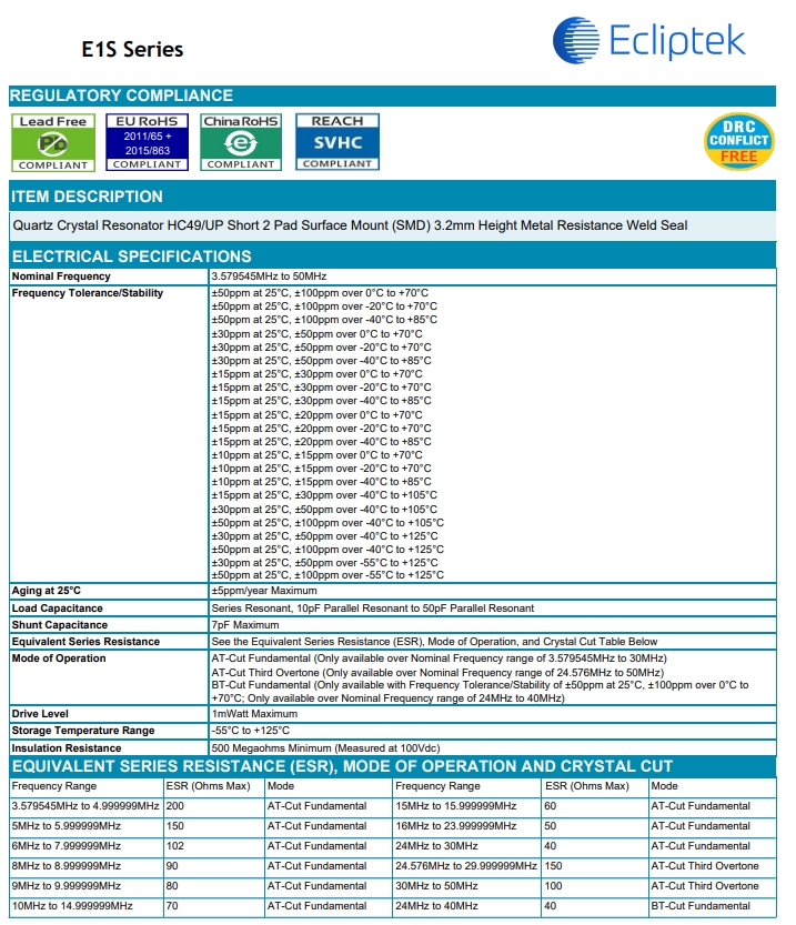E1SAA12-30.000M TR|ECLIPTEK晶振|12PF,物料編碼E1SAA12-30.000M,頻率30MHZ,精度±100ppm,負載電容12PF, 尺寸: 13.3*4.85*3.2mm,溫度范圍:0℃-70℃,SMD晶振,無源晶振,石英晶振,ECLIPTEK晶振,歐美晶振,晶振,石英晶體諧振器,應用于飛機雷達,飛機航線系統,飛機廣播,飛機發動機控制系統,飛機顯示系統,飛機遙控門鎖,