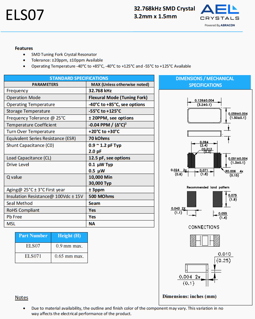 AEL進口環保晶振,ELS07高精度音叉晶振,ELS07-32.768kHz-6-T物聯網終端晶振