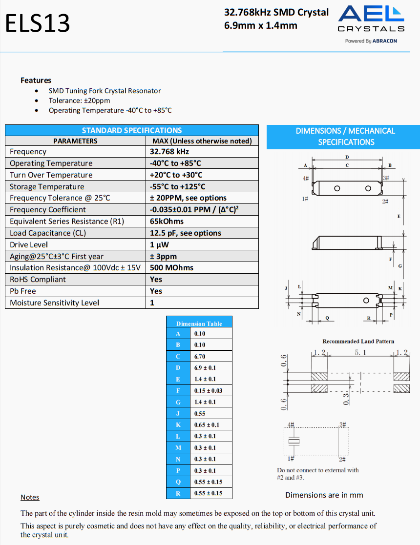 ELS07-32.768kHz-T AEL晶振 ELS07 32.768 kHz 0 ±20ppm 12.5 pF