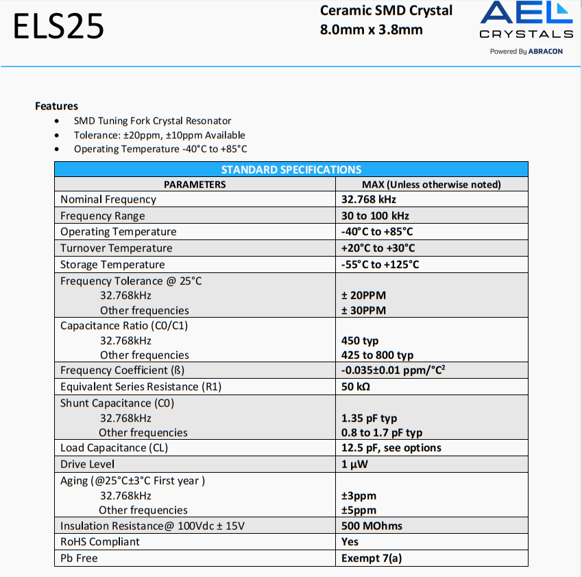 ELS25-32.768kHz-T AEL晶振 ELS25 32.768 kHz ±20ppm 12.5 pF