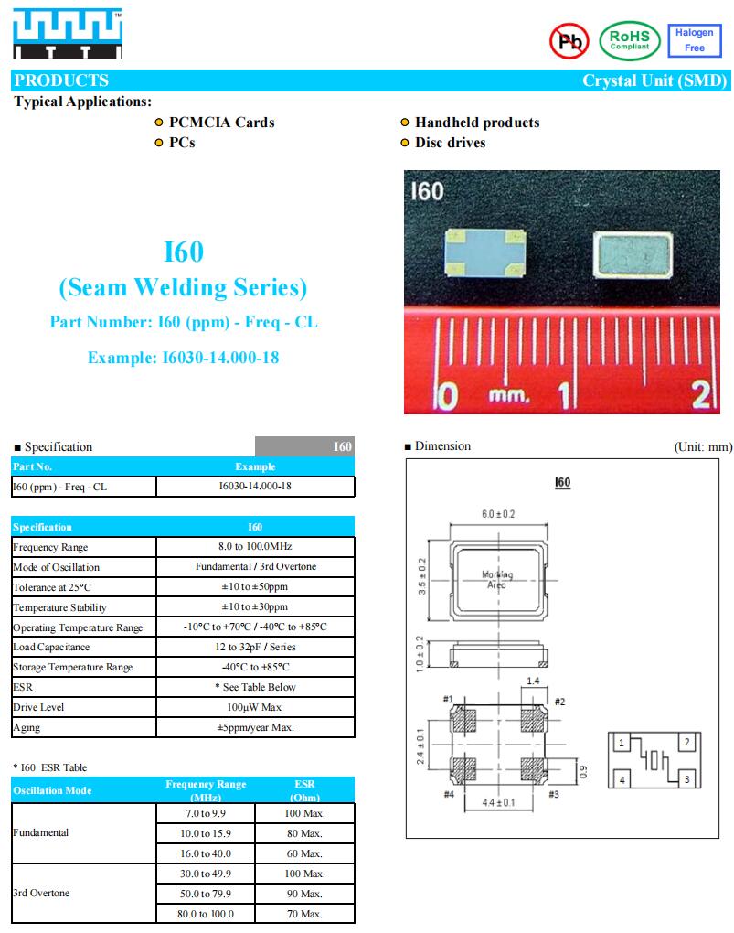 ITTI Crystal,6035mm晶振,I6020-52.000-16,6G個人通信晶振規(guī)格表
