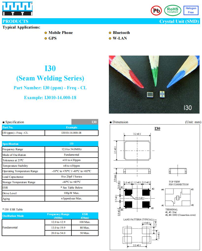 美國ITTI晶振,I3010-12.000-18,6G路由器晶振規格表