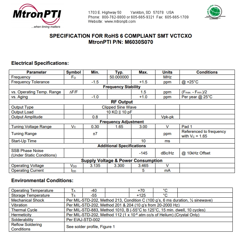 | M6030S070 50.000000 | M630x | ±1.5 ppm | 50 | 5.0 x 7.0 mm | -40°C- +70°C | 3.3 |