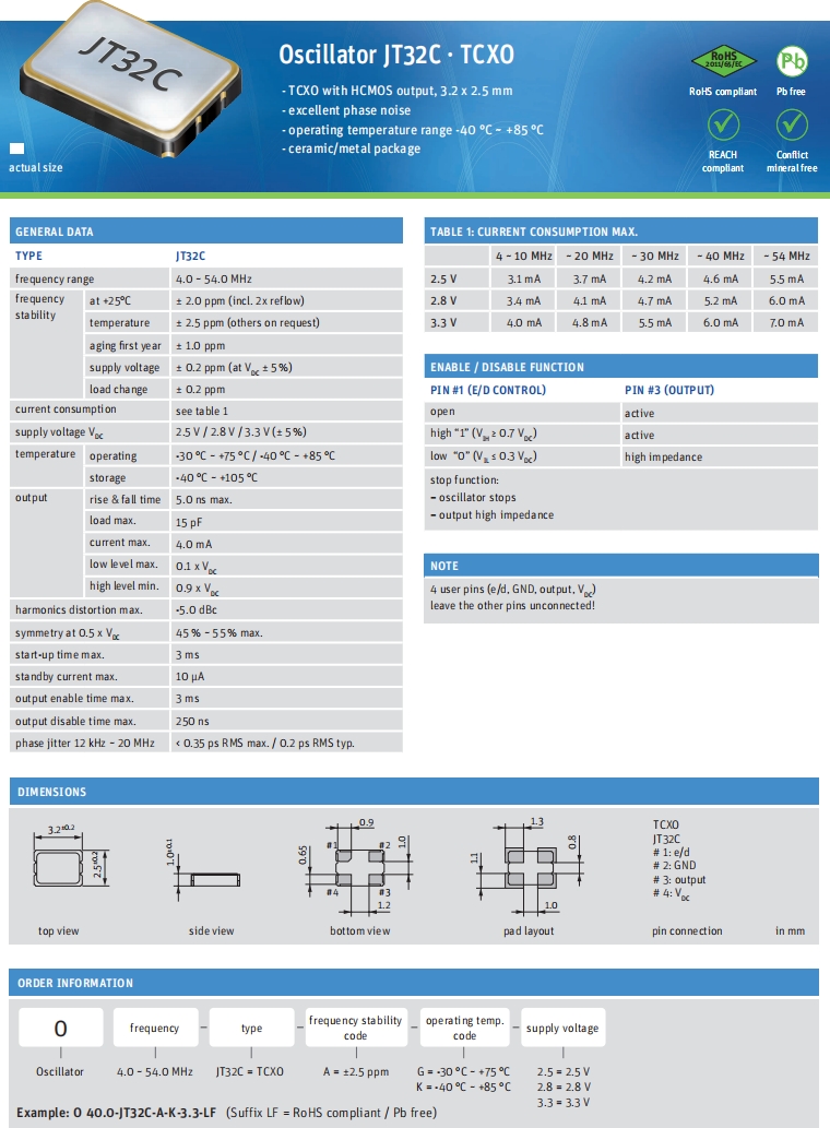| Q 0.032768-JTX310-9-20-T2-HMR-LF | Jauch晶振 | JTX310 | 32.768kHz | ±20ppm | 9pF | -40°C ~ 105°C |