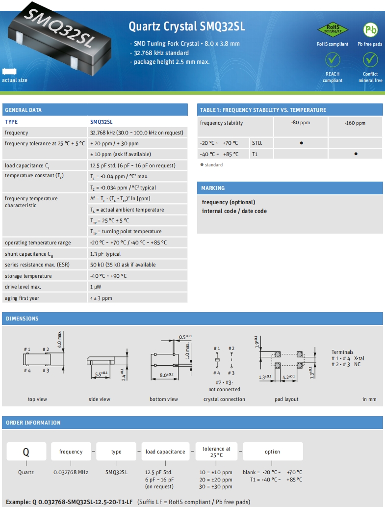 Q 0.032768-SMQ32SL-9-10-T1-LF|Resonator Crystal,Jauch晶振,SMQ32SL音叉晶體,無源晶振,Q 0.032768-SMQ32SL-9-10-T1-LF晶振,進口晶振,石英晶體諧振器,8038貼片晶振,頻率32.768KHz,負載9pF,頻率穩定性10ppm,工作溫度-40~85°C,高可靠性晶振,耐高溫晶振,高性能晶振,智能手機晶振,平板電腦晶振,測試與測量儀器晶振,兒童用游戲機晶振.