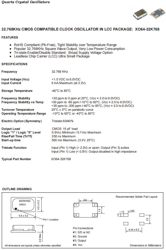XO64-32K768-B30B3|32.768KHz|3.3V|富通時鐘振蕩器,富通晶振,XO64-32K768時鐘振蕩器,有源晶振,XO64-32K768-B30B3晶振,石英晶體,6.5×4.0mm晶振,四腳貼片晶振,SMD晶體,頻率32.768KHz,電壓3.3V,頻率穩(wěn)定性30ppm,工作溫度-40~85°C,低功耗晶振,高穩(wěn)定性晶振,高品質晶振,微處理器時鐘晶振,COTS網絡設備晶振,以太網晶振,數據中心晶振.