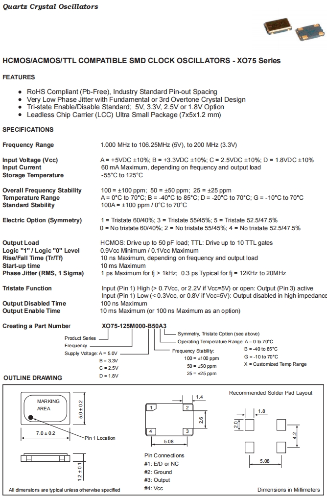 XO75-125M000-B50B3|125MHz|3.3V|Fortiming晶振,歐美進口晶振,Fortiming晶振,XO75有源晶振,貼片晶振,XO75-125M000-B50B3晶振,石英晶體振蕩器,7050mm晶振,四腳封裝晶振,頻率125MHz,電壓3.3V,頻率穩定性50ppm,工作溫度-40~85°C,高穩定性晶振,低老化晶振,無鉛環保晶振,電信交換機晶振,測試與測量設備晶振,智能家居晶振,數碼產品晶振.
