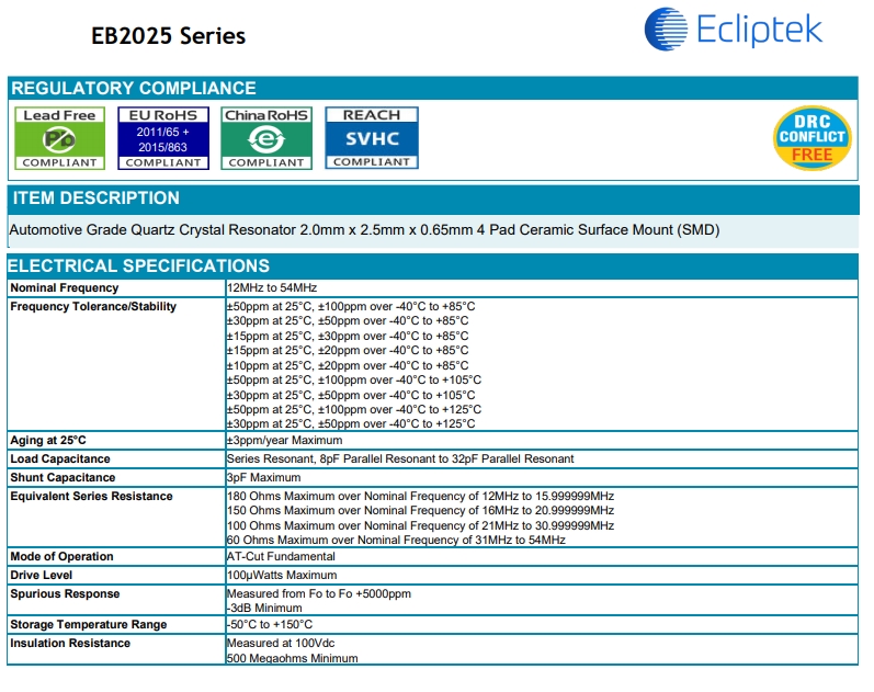 EB2025YA10-25.000M TR|EB2025晶振|貼片晶振,物料編碼EB2025YA10-25.000M TR,型號EB2025,頻率25MHZ,精度±50ppm,負載電容10PF, 尺寸: 2.5*2.0*0.5mm,溫度范圍:-40℃-125℃,四腳晶振,晶振,源晶振,石英晶振,ECLIPTEK晶振,晶振廠家,石英晶體諧,應用于數碼游戲機,相機,無線對講機,麥克風,藍牙音響,飛行器.