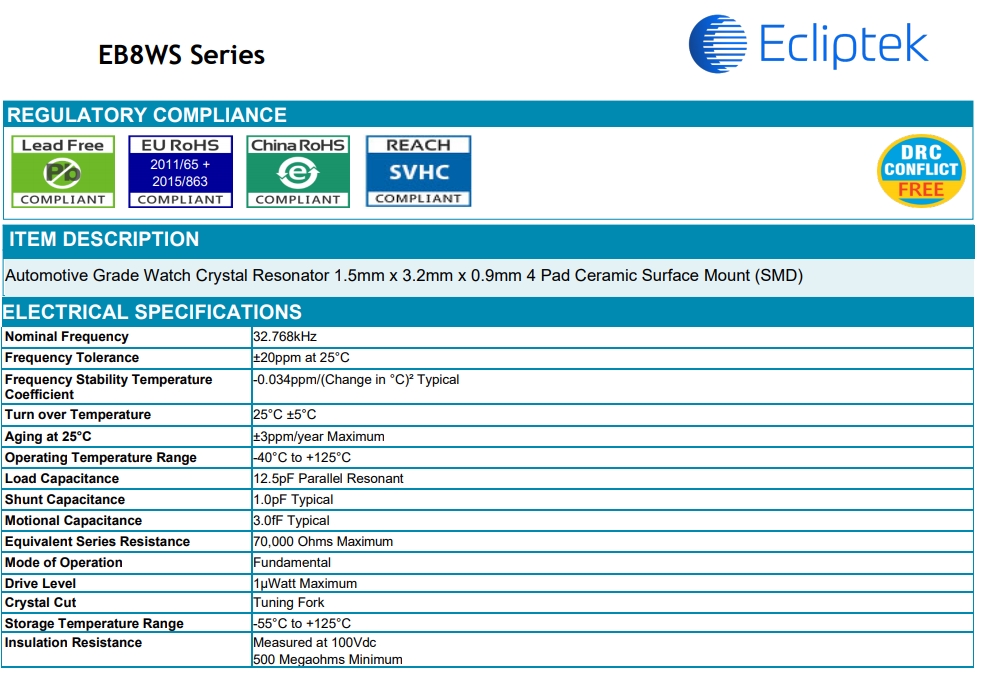 EB8WSDX12-32.768K TR|EB8WS晶振|32.768 kHz,物料編碼EB8WSDX12-32.768K TR,型號EB8ES,頻率32.768KHZ,精度±20ppm,負載電容12.5PF, 尺寸: 3.2*1.5*0.9mm,溫度范圍:-40℃-125℃,晶振,無源晶振,石英晶振,ECLIPTEK晶振,晶振廠家,石英晶體諧振器,應用于車載充電器,車載鑰匙,車載安全系統,車載自動駕駛系統,車載空調,車載黑匣子.