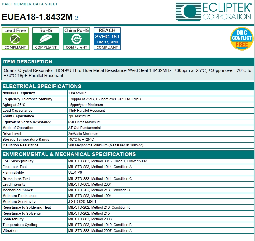 EUEA18-1.8432M|1.8432MHz|無源晶振,物料編碼EUEA18-1.8432M,頻率1.8432MHZ,精度±30ppm,負載電容18PF,尺寸:2-Pin HC-49/U,溫度范圍:-20℃-70℃,無源晶振,ECLIPTEK晶振,歐美晶振,插件晶振,石英晶振,應用于MP3,MP4,PM5,錄音筆,藍牙耳機,U盤,網(wǎng)卡,USB轉(zhuǎn)接器等.