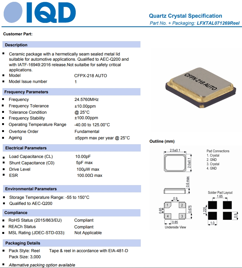 LFXTAL071269REEL|Resonator Crystal,IQD晶振,CFPX-218無源晶振,LFXTAL071269REEL晶振,石英晶體諧振器,2520貼片晶振,進(jìn)口石英晶振,SMD晶體,頻率24.576MHz,負(fù)載10pF,頻率容差10ppm,工作溫度-40~125°C,耐高溫晶振,抗沖擊晶振,輕薄小晶振,信息娛樂系統(tǒng)晶振,高級(jí)駕駛輔助系統(tǒng)晶振,GPS導(dǎo)航晶振,汽車音響控制器晶振.