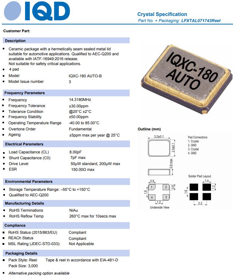 LFXTAL071743REEL|Resonator Crystal,IQD晶振,IQXC-180AUTO無源晶振,LFXTAL071743REEL晶振,石英晶體諧振器,四腳貼片晶振,進口晶振,3225貼片晶振,頻率14.318MHz,負載8pF,頻率容差30ppm,工作溫度-40~85°C,高穩定性晶振,輕薄小晶振,耐高溫晶振,醫療電子設備晶振,全球衛星導航晶振,遠程信息處理晶振,汽車動力系統晶振.