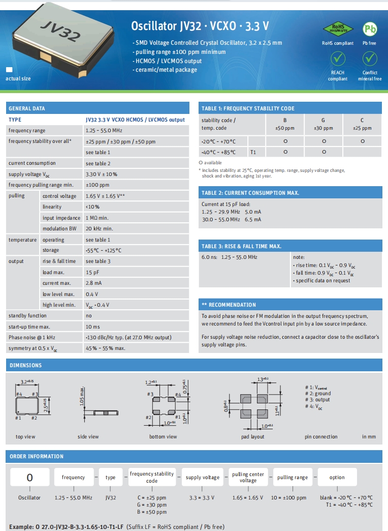 | Phase noise @ 1 kHz | -130 dBc/Hz typ. (at 27.0 MHz output) | |