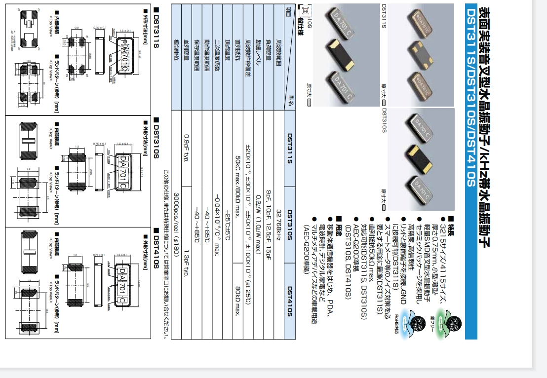 1TJF0SPDP1AI008|DST310S|3215mm|32.768KHZ|10PF|DSK大真空,32.768KHZ系列產品.日產進口晶振,石英晶體諧振器,編號1TJF0SPDP1AI008,型號DST310S,尺寸3215mm,頻率范圍32.768KHZ,負載電容10pF,精度20ppm,超小體積型,輕薄型晶振,運行溫度和保存溫度-40°C-+85°C,使用相機,鐘表,手機,電腦等設備,產品具有優良的耐熱性,耐環境特性,可發揮晶振優良的電氣特性,符合RoHS規定,滿足無鉛焊接的高溫回流溫度曲線要求,金屬外殼的封裝使得產品在封裝時能發揮比陶瓷振蕩器外殼更好的耐沖擊性.