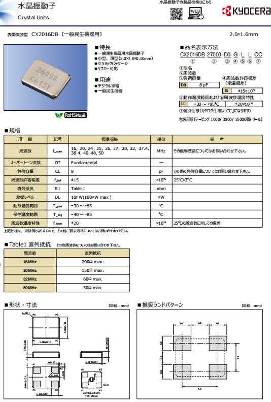 | CX2016DB16000D0FLJCC | AVX Corp/Kyocera Corp | CX2016DB, Kyocera | MHz Crystal | 16MHz | -30°C ~ 85°C |