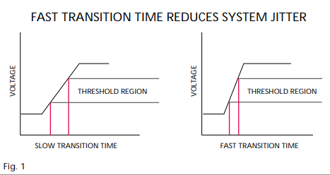 在更高的速度,傳輸線和他們的組件表現不同他們以較低的速度做,產生這樣的信號完整性問題,如抖動,噪聲,反射和如果沒有正確指定和配置串擾,如果源要用作顯示時鐘參考,結果將是模糊的顯示,通常,時鐘晶振信號通過的速度越快過渡區域,系統抖動越小生產(見圖1),減少排放,在高速應用中,產生電磁干擾的可能性(EMI)急劇增加,FCC規定關于EMI降噪正在變得越來越多更快的數字速度更嚴格. 設計師需要解決傳輸等特性線,差分信號,信號幅度和諧波含量以最大化能量將被送到負載,從而減少能量排放量,確保穩定,一般來說,越高規定的電子工作頻率你正在設計的系統,越關鍵時鐘穩定性是,時鐘性能不穩定會導致誤碼率增加,錯誤無論是數據系統中的數據還是錯過的數據它們是本地或廣域系統,傳輸線阻抗匹配,該整個傳輸的阻抗和長度必須測量線并與每個線匹配終止,如果忽略阻抗匹配,可能發生發射,串擾和反射.