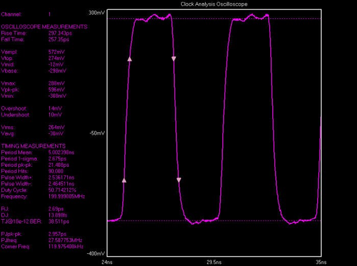 雖然周期抖動的官方定義是測量時鐘周期與理想周期之間的差異,但在實際應用中,通常很難量化理想周期.如果我們使用示波器觀察振蕩器設置為125MHz的輸出,則平均測量時鐘周期可能為7.996nS而不是8nS.因此,將平均觀察時段視為理想時段更為實際,并且是時序設備制造商的常見做法.測量周期抖動的標準程序包括隨機測量一個時鐘周期的持續時間10,000次,并使用記錄的數據計算平均值,標準偏差和峰峰值.由于周期抖動的隨機性,峰峰值可能會有很大差異,