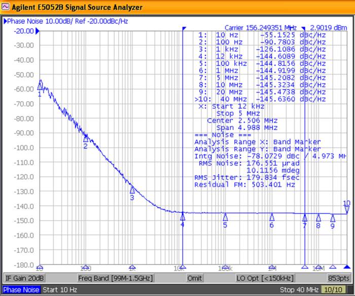 為了測量相位噪聲,使用AgilentE5052B.5052B包括兩個獨立的PLL路徑,兩個內置參考源彼此不相關(還有一個外部參考源選項).如果兩個信號不相關,則它們的矢量和,即通過矢量平均得到的參考源的總噪聲功率,通過消除來自其內部參考源和其他相關電路的噪聲來降低系統本底噪聲,同時來自DUT的噪聲信號強調.這允許快速且用戶友好的測試,主要缺點是一次只能測試一個設備.E5052B還可以計算所需范圍內的積分噪聲(參見下面的示例,測量范圍為12kHz至5MHz),并計算積分相位抖動.