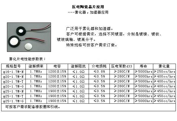 一般情況下我們知道,在正確的使用情況下,陶瓷霧化片的使用壽命約3000小時(shí),且極易更換。公司從2005年開始在中國科學(xué)院科學(xué)研究院物理研究所、中國納米材料研究所與技術(shù)合作與支持下的基礎(chǔ)上歷時(shí)一年多經(jīng)過上百次的的試驗(yàn)、,不斷完善工藝、檢測設(shè)備,并自由開發(fā)了一套霧化檢測線,完全滿足客戶的需求進(jìn)行批量生產(chǎn),并且保證發(fā)給客戶的產(chǎn)品100%的合格,在直徑的一致性和穩(wěn)定性上可以完全滿足客戶的需求。泰河廠家生產(chǎn)的霧化片具有的特點(diǎn)更是將霧化片的功能發(fā)揮到極致,且不說價(jià)格能做到同行最低,能提供所有不同片面的霧化片,就已經(jīng)堪稱是中國最有實(shí)力的霧化片廠商了。例如不銹鋼霧化片,鍍鎳霧化片,鍍鈦霧化片,耐酸堿霧化片。它除了高溫度的物理化學(xué)性能以外,還具有彈性震動(dòng)耗損極小,而品質(zhì)因素可達(dá)到百萬這可貴特點(diǎn)。因此他是一種用于頻率穩(wěn)定和選擇頻率的電子器件,廣泛主要應(yīng)用于各類醫(yī)療微量霧化,USB加濕器,香水霧化器,香薰霧化器。精油霧化器,各類無棉芯加濕器,美容類的各類霧化裝置等產(chǎn)品。霧化片,涉及水霧發(fā)生設(shè)備領(lǐng)域等產(chǎn)品都需要用到,主要包括壓電陶瓷片和金屬外殼,壓電陶瓷片置于金屬外殼內(nèi),壓電陶瓷片下表面設(shè)有金屬電極,金屬電極與壓電陶瓷片連接,其特征是在金屬外殼外表面設(shè)有保護(hù)層。我公司霧化片克服現(xiàn)有技術(shù)中的霧化片容易被腐蝕或電蝕的缺點(diǎn),提供一種耐蝕性強(qiáng),使用效果好,壽命長的霧化片。
