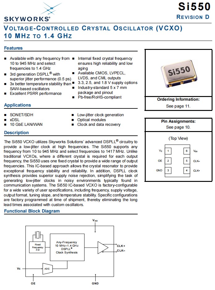 Silicon晶振型號Si550 VCXO利用天空解決方案的先進DSPLL®電路提供一個高頻低抖動時鐘。Si550壓控晶振支持從10到945MHz的任何頻率,并選擇頻率到1417MHz。與傳統的VCXOs不同,每個輸出頻率都需要一個不同的晶體,而Si550使用一個固定的晶體來提供一個大范圍的輸出頻率。這種基于集成電路的方法允許晶體諧振器提供特殊的頻率穩定性和可靠性。此外,DSPLL時鐘合成提供了優越的電源噪聲抑制,簡化了在通信系統中常見的噪聲環境中產生低抖動時鐘的任務。基于石英晶體振蕩器Si550ic的VCXO可在工廠中進行配置,適合各種用戶規格,包括頻率、電源電壓、輸出格式、調諧斜率和溫度穩定性。特定的配置是在裝運時進行工廠編程的,從而消除了與定制振蕩器相關的長交貨時間。低抖動時鐘生成專用晶振550CD74M2500DGR