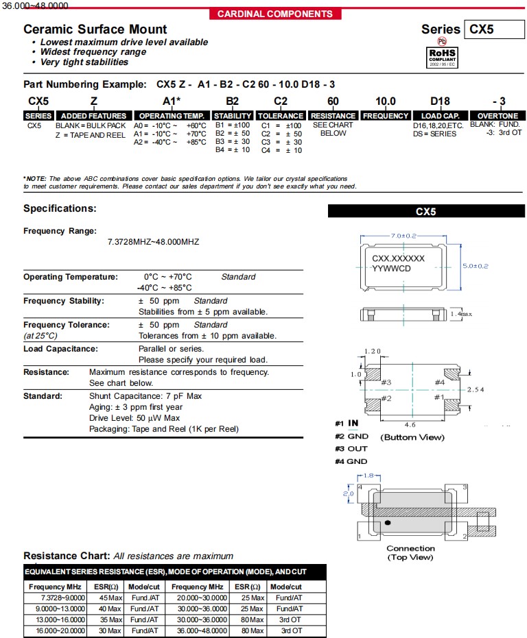 美國Cardinal卡迪納爾晶振CX5系列,小體積晶振尺寸7.0x5.0x1.4mm四腳貼片晶振,無源晶振,石英晶體諧振器,無鉛環(huán)保晶振,頻率范圍:7.3728MHz至48MHz,工作溫度范圍:-40℃至+85℃,微型薄型表面貼裝石英晶體,封裝是自動化表面貼裝的理想選擇組裝和回流實(shí)踐。 帶卷包裝。 AT切割水晶,具有超小型,輕薄型,耐熱及耐環(huán)境特點(diǎn),該貼片晶振用于:WiFi、藍(lán)牙、無線局域網(wǎng)、物聯(lián)網(wǎng)、可穿戴設(shè)備、Zigbee、微處理器時鐘應(yīng)用晶振CX5Z-A5B2C5-40-12.0D18