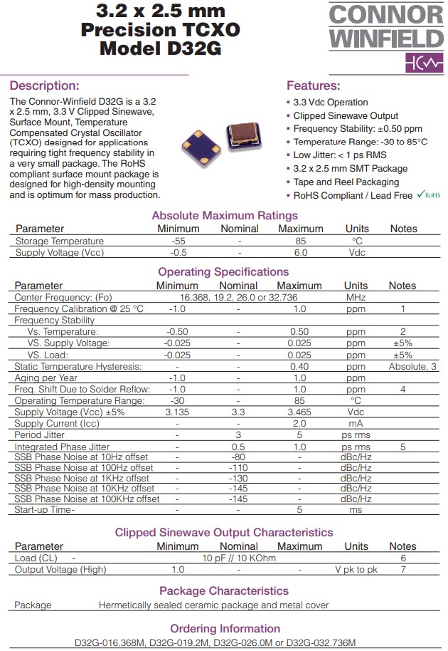 | D32G-026.0M | ConnorWinfield | D32G | 26MHz | -30°C ~ 85°C | 4-SMD, No Lead |