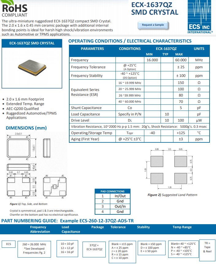 ECS晶振ECX-1637QZ是一種加固型、符合AEC-Q200標準的2.0毫米x 1.6毫米晶體。ECS晶振新推出ECX-1637QZ產品系列是一款2.0毫米x1.6毫米x0.45毫米的四腳貼片晶振,符合AEC-Q200標準,具有5000克0.3毫秒的加固抗震性能。這種表面貼裝(SMD)晶體提供16MHz至60MHz的頻率范圍,在-40°C至+125°C的汽車擴展溫度范圍內,頻率容差精確到10ppm,頻率穩定性精確到50ppm,這種ECS-260-12-37QZ-ADS-TR緊湊型晶體非常適合汽車、醫療和工業應用。