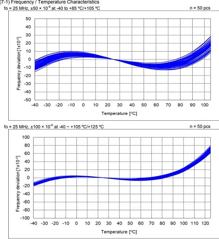 但是值得注意的是,任何事物都有極限,石英晶振也有,那么這里的-40-125℃就是這款產(chǎn)品的極限了,超出這個范圍會發(fā)生不可預(yù)知的事情,比如損壞,性能,穩(wěn)定性下降等等;但是在這種極限條件下它的穩(wěn)定性依舊是比不上在-40-85℃,因為高溫環(huán)境會削弱晶振的穩(wěn)定性,使其穩(wěn)定性降低,這可以通過溫頻特性曲線很明顯的看出.不過能在這樣高溫環(huán)境下穩(wěn)定起振就已經(jīng)非常了不起了.