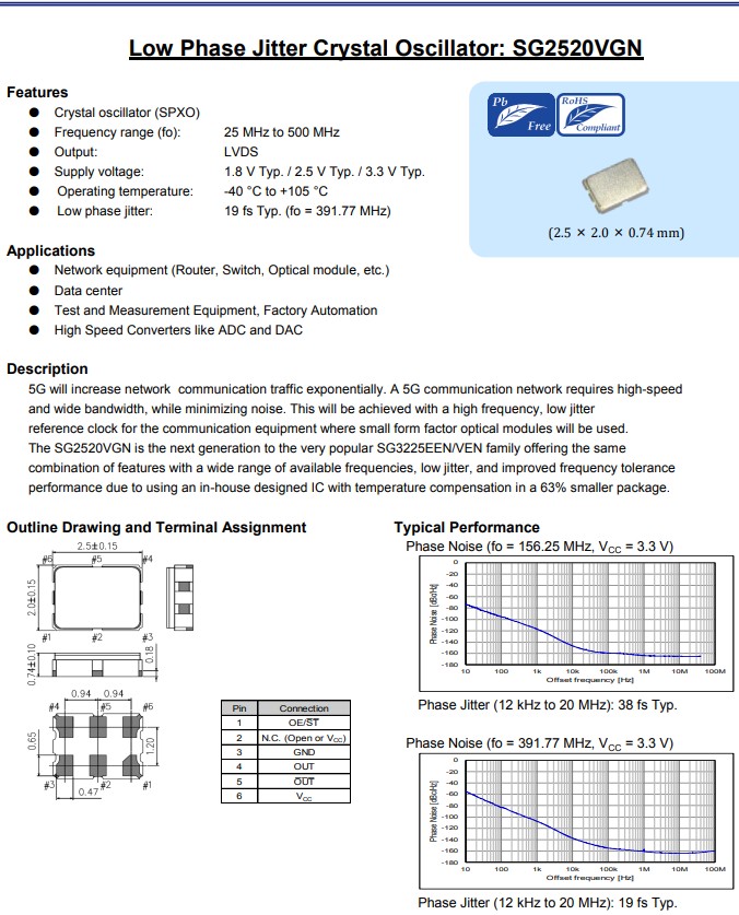 愛普生晶振SG2520VGN是非常受歡迎的SG3225EEN/VEN系列的下一代產品,小體積尺寸2.5x2.0mm封裝,六腳貼片晶振,石英晶體振蕩器,支持LVDS輸出差分晶振,具有廣泛的可用頻率、低抖動,低功耗,低相位噪聲,低損耗,低耗能,低電平等特點,廣泛應用于5G通訊設備、機頂盒、光端機、安防設備、路由器/交換機、儀器儀表、SATA,SAS,光纖通信,10G以太網及各種頻率控制設備上。