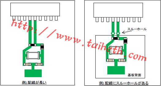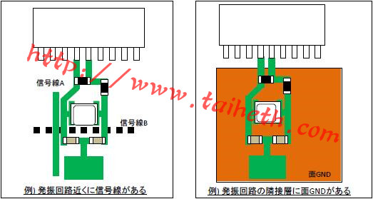 另外,當(dāng)用接地圖案圍繞振蕩電路圖案作為EMI的對(duì)策時(shí),如果振蕩電路圖案和接地圖案彼此非常接近,剛寄生電容將增加并且因此負(fù)電阻將減小,所以應(yīng)當(dāng)小心.