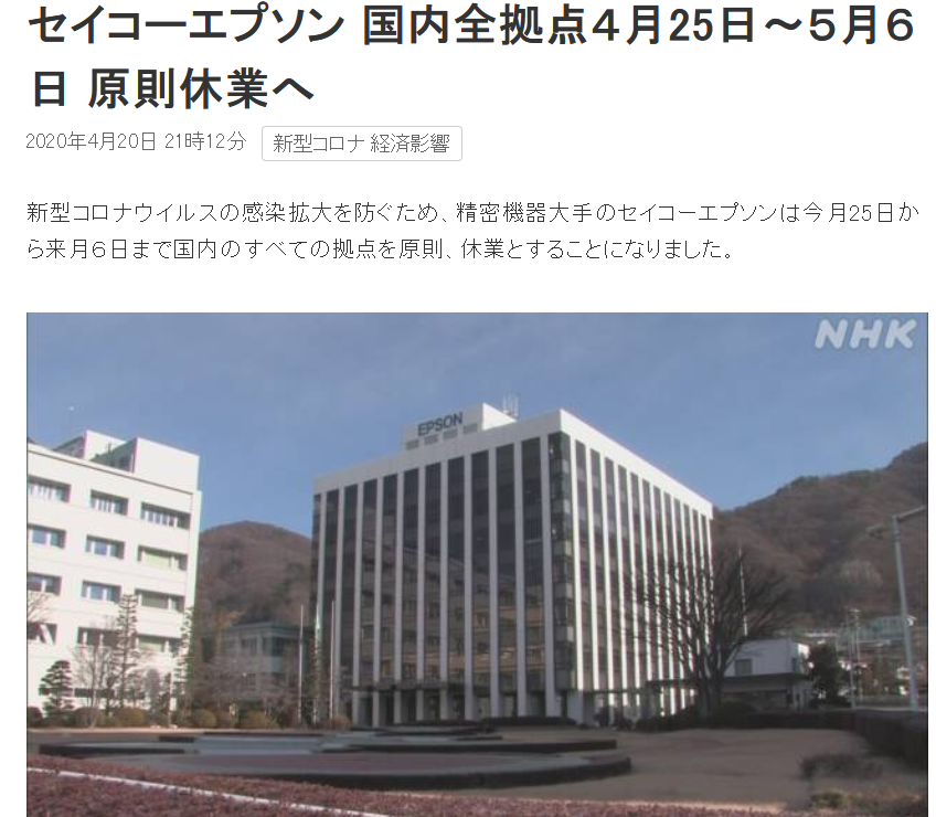 セイコーエプソン株式會社(以下エプソン)は、日本政府による「緊急事態宣言」の全國拡大を受け、エプソングループの國內拠點を4月25日(土)から5月6日(水)まで休業することとしました。