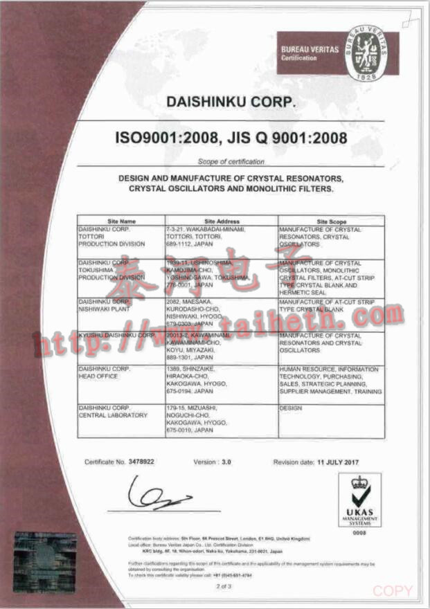 日本大真空株式會社KDS晶振公司成立于1951年,是全球領先的石英晶振制造商之一.1959年在日本神戶市成立加工生產石英晶體,及石英晶體振蕩器.1973年開設西脅工廠,開始生產插件晶振,圓柱晶體等.1974年開設川廠(現在的涼廠)是目前人造石英晶振,石英晶體振蕩器,差分晶振,恒溫晶體振蕩器生產規模最大的工廠.而后又在日本開設宮崎工廠,是現在的九州大真空晶振公司,總部位于日本加古市.于1993年被天津政府對外資招商部特別邀請在中國天津投資設立工廠,當時的5月份就在天津的武清開發區確定投資建廠.1996年榮獲國際標準化組織質量管理體系標準ISO9001:2008認證.