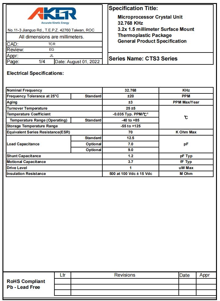 CTS3-32.768-7-20-X-R|32.768KHz|7pF|AKER安基晶振規格表