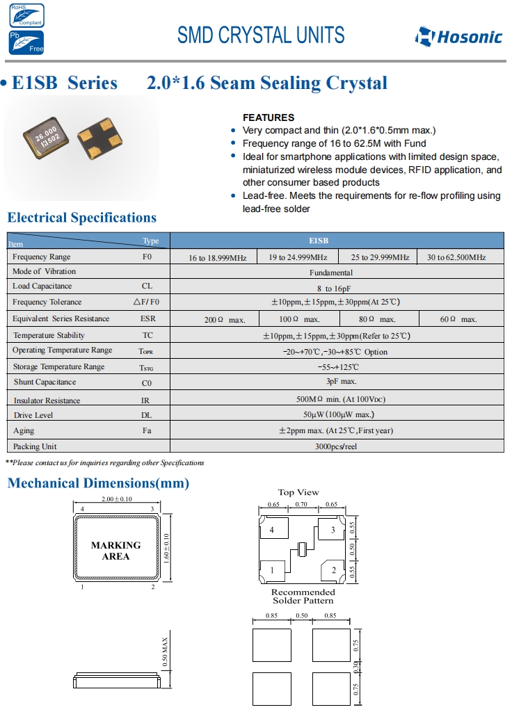| E3SB16.0000F18E22 | Hosonic晶振 | E3SB | 16 MHz | 18 pF | ±20 ppm | ±20 ppm |