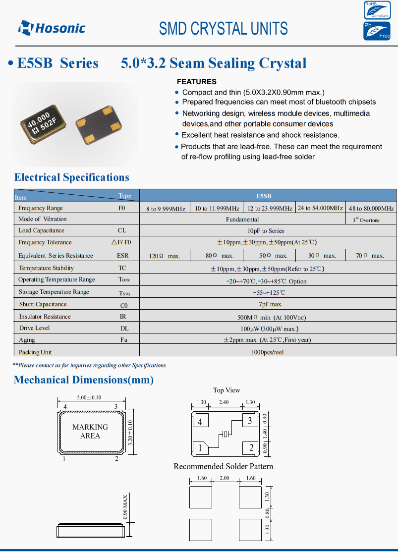 E5SB10E000007E無源晶振,鴻星低損耗晶振,領先同行的智能網卡晶振,特點:輕薄小 (最大5.0x3.2X0.90mm)。準備好的頻率可以滿足大部分藍牙芯片組的,網絡設計無線模塊設備、多媒體設備和其他便攜式消費設備·優異的耐熱性和抗沖擊性。·無鉛產品。這些方法可以滿足使用無鉛焊料進行再流分析的要求,臺灣鴻星晶振公司,貼片晶振,無源晶振,5032晶振,高精度晶振,高性能晶振,四腳晶振,石英晶振,高品質晶振,低損耗晶振,低功耗晶振,藍牙音箱晶振,智能網卡晶振,智能電表晶振,無線信號傳輸設備晶振,6G局域網晶振,6G衛星晶振,北斗導航定位晶振。