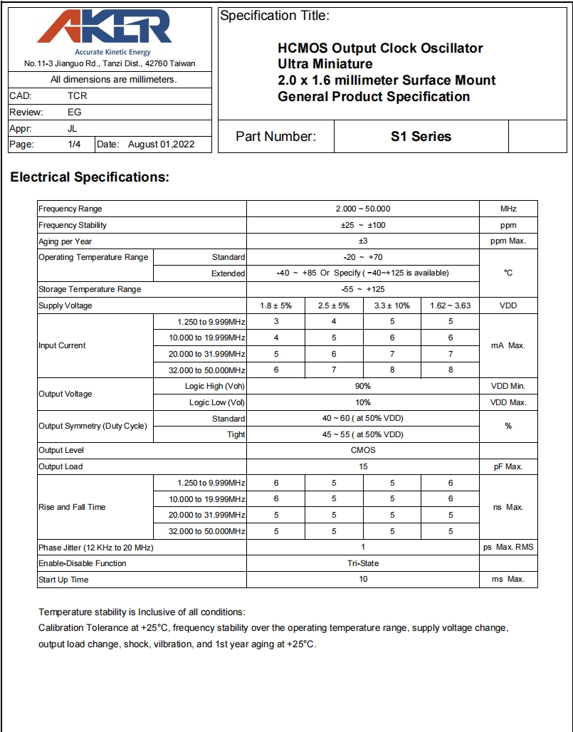 S133025T-50.000-X-R3|50MHz|3.3V|臺(tái)灣AKER晶振規(guī)格表