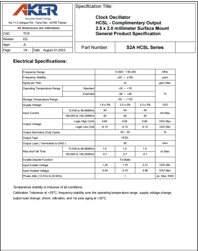 S2A3305-156.250-H-X-R|156.25MHz|3.3V|AKER安基晶振特點:
